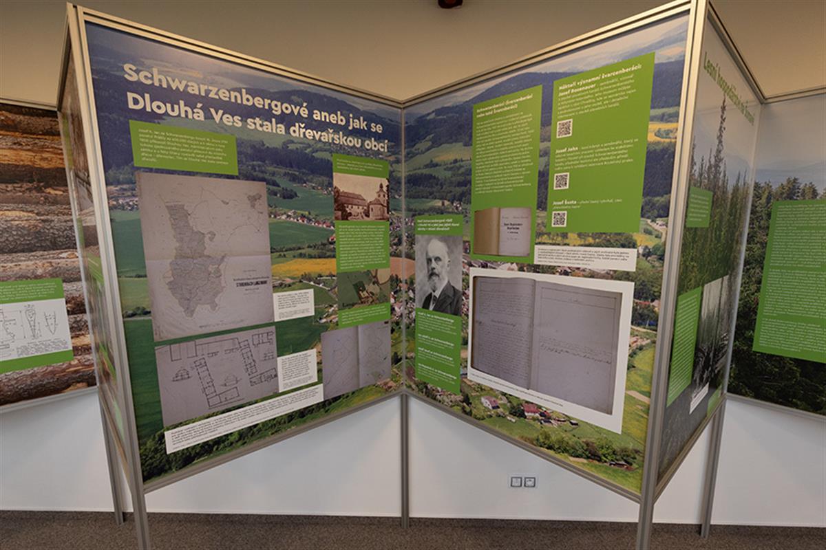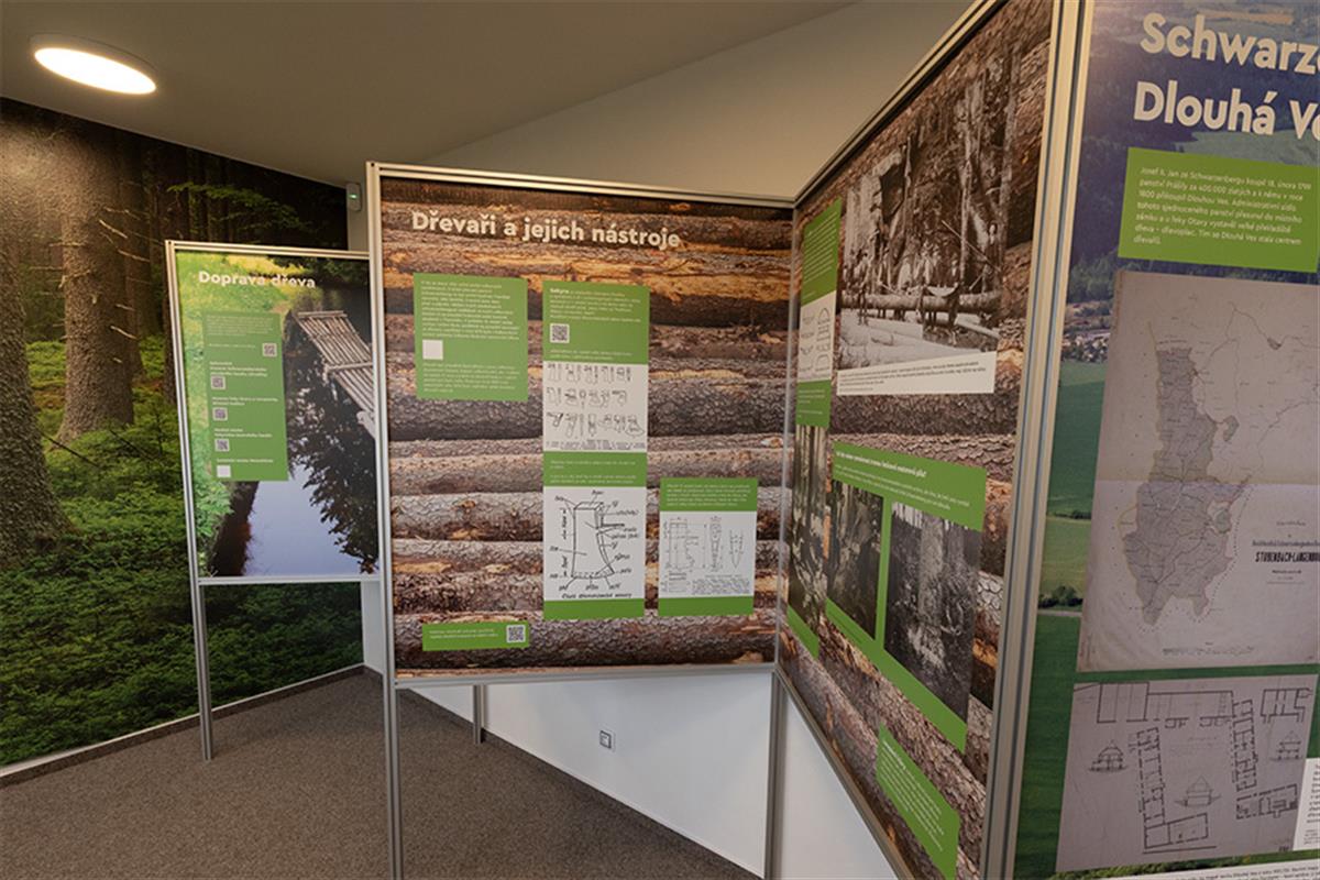 Vznikla v rámci projektu přeshraniční spolupráce Česká republika – Svobodný stát Bavorsko: 133 - Dřevařství na Šumavě a v Bavorském lese, Forst- und Holzwirtschaft im Böhmerwald und im Bayerischen Wald, libreto vytvořili pracovníci Západočeské univerzity v Plzni.Expozice objasňuje, proč a jak byl osud obce Dlouhá Ves za vlastnictví rodu Schwarzenbergů spojen s rozvojem dřevařství, jak „zlatý brouček“ ovlivnil život obyvatel Šumavy. Ukazuje také typické dřevařské činnosti a nářadí při něm používané, stejně jako se dotýká i každodenního života dřevařů – od typických dřeváků zvaných nejšle až po důchodový přídělový systém, který rod Schwarzenbergů pro své dřevaře vytvořil již v 19. století.