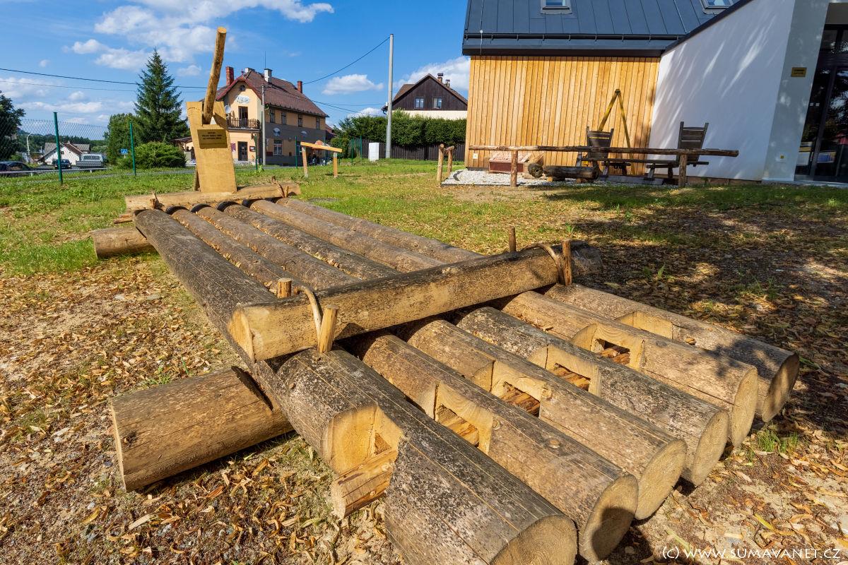 I v době uzavření hlavní budovy může návštěvník získat informace o dřevařství. K vidění jsou saně na svážení dřeva, replika vorové tabule, či zvětšená maketa krabičky zápalek – výrobku typického pro dřevařské provozy v údolí řeky Otavy.Naučná stezka
